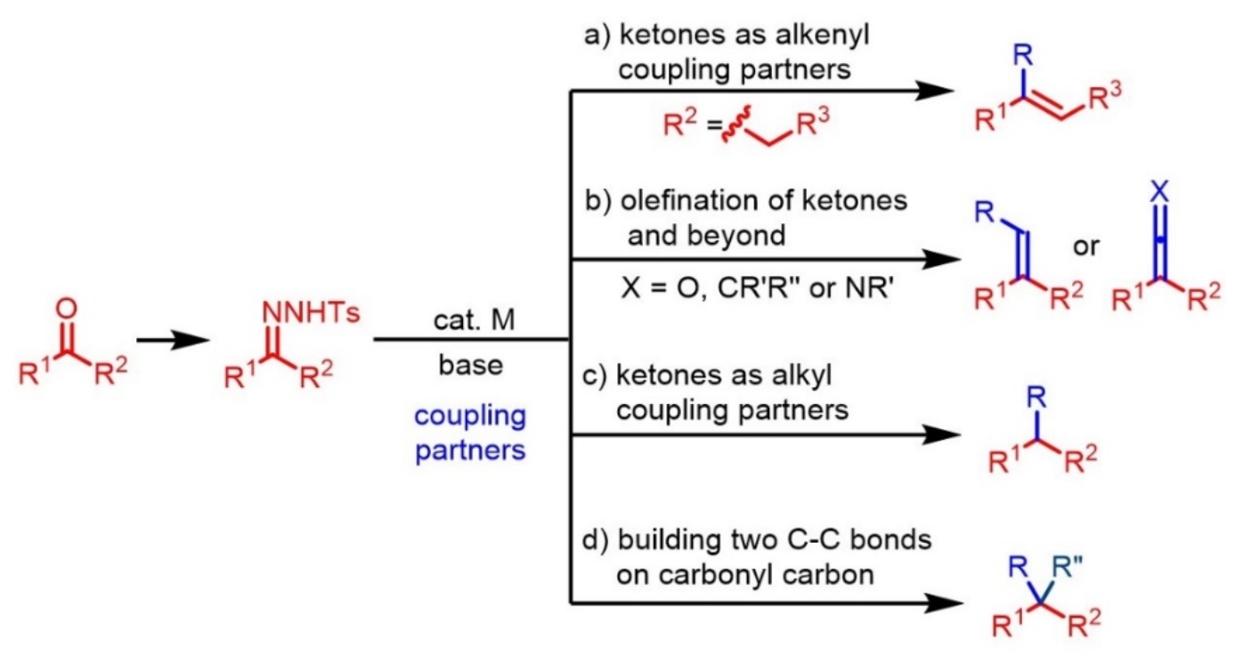 Based on the types of C-C bonds formed in the cross-coupling reaction of ketones and aldehydes, these transformations are roughly divided into four categories:a) The ketones serve as alkenyl coupling partners, forming C−C single bonds to produce poly-substituted olefins; b) New C="C" double bonds are constructed on the carbonyl functionality, which can be regarded as carbonyl olefination transformations. The formation of allene, ketene and ketenimine on the carbonyl functionality also falls into this category; c) Ketones serve as alkyl coupling partners, forming C−C single bonds to produce the corresponding alkylation products; d) Ketones serve as amphiphile, in which two C−C single bonds are formed on the carbonyl carbon. After introducing the latest progress of these four kinds of reactions, the Perspective points out their problems and limitations, and the possible further developments in this field.