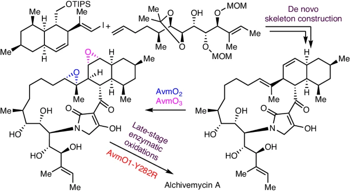 Alchivemycin A belongs to a unique class of polyketide natural products isolated from plant-derived actinomycete Streptomyces. It shows potent antibacterial activity and anti-tumour activity. However, its inherent structural complexity and high oxidation state, especially the 2H-tetrahydro-4,6-dioxo-1,2-oxazine (TDO) ring system, present synthetic challenges. Here we report the total synthesis of alchivemycin A using a chemoenzymatic approach that combines de novo skeleton construction and late-stage enzymatic oxidation reactions. The convergent synthesis of the highly functionalized unnatural tetramic acid-bearing intermediate is achieved by boron-alkyl Suzuki−Miyaura cross-coupling, macrolactamization and Lacey–Dieckmann condensation reactions. Efficient enzymatic epoxidations using the redox enzymes AvmO3 and AvmO2 allow rapid access to the desired diepoxide product regio- and stereoselectively. Subsequently, a flavin adenine dinucleotide-dependent enzyme AvmO1 variant optimized via rational protein engineering, AvmO1-Y282R, was used to convert the tetramic acid ring into the TDO ring through a Baeyer–Villiger-type transformation, completing the chemoenzymatic synthesis of alchivemycin A. This work paves the way to further explore the biological functions of alchivemycin A and highlights the utility of chemoenzymatic strategies to tackle synthetic challenges in complex molecule synthesis.