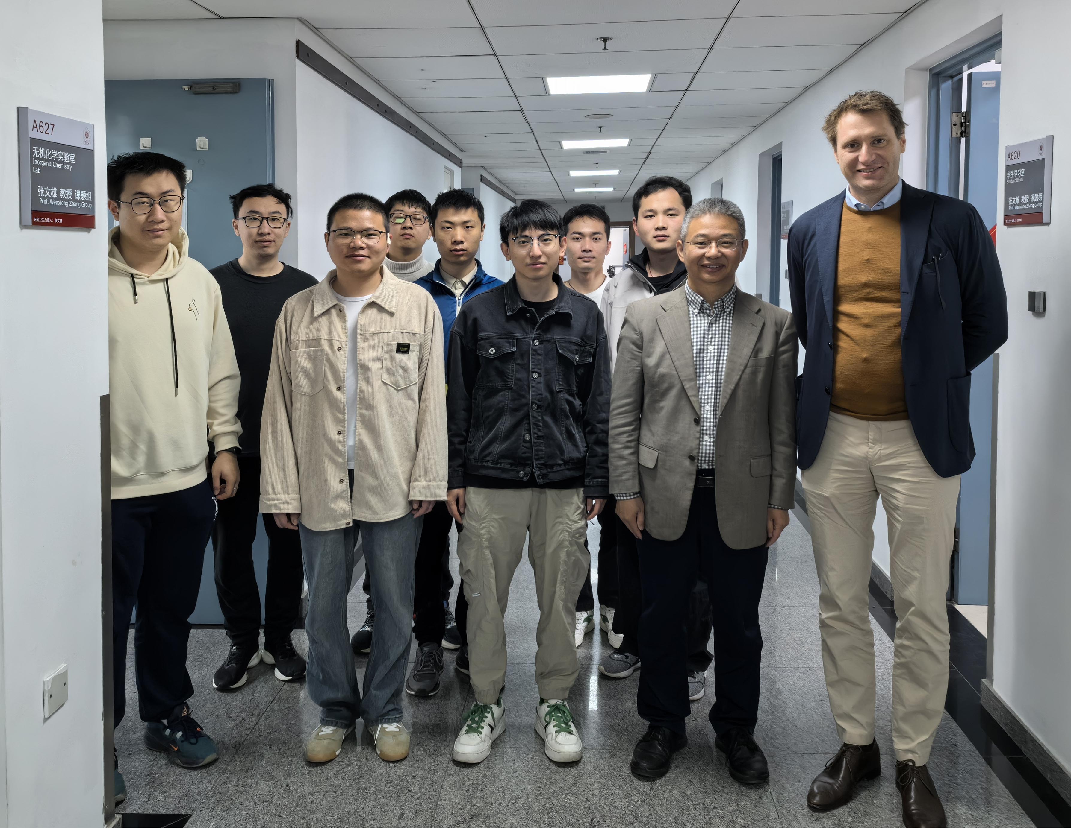 4 月 12 号,德国哥廷根大学 Sven Schneider 教授和中国科学技术大学汪义丰教授受席老师和许言研究员邀请来到威尼斯官网威尼斯欢乐娱人城v3676报告。他们的报告题目分别为“Electro- and Photochemical Strategies for N2 Fixation beyond Ammonia” 和 “硼自由基介导和催化的新反应研究”。报告结束后,张老师邀请他们来到实验室参观,期间为他们讲解了研究室展板内容和 Logo 含义,最后大家一起合影留念。值得一提的是,研究室的毕业生吕泽杰博士目前正在 Sven Schneider 教授课题组进行博士后研究。