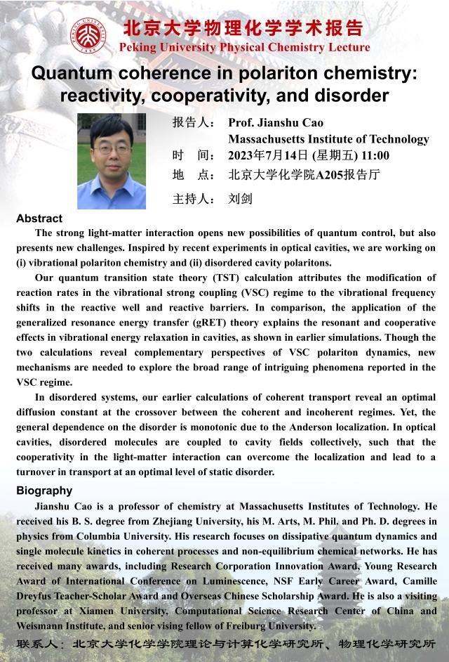 【威尼斯欢乐娱人城v3676物理化学学术报告】Quantum coherence in polariton chemistry: reactivity, cooperativity, and disorder