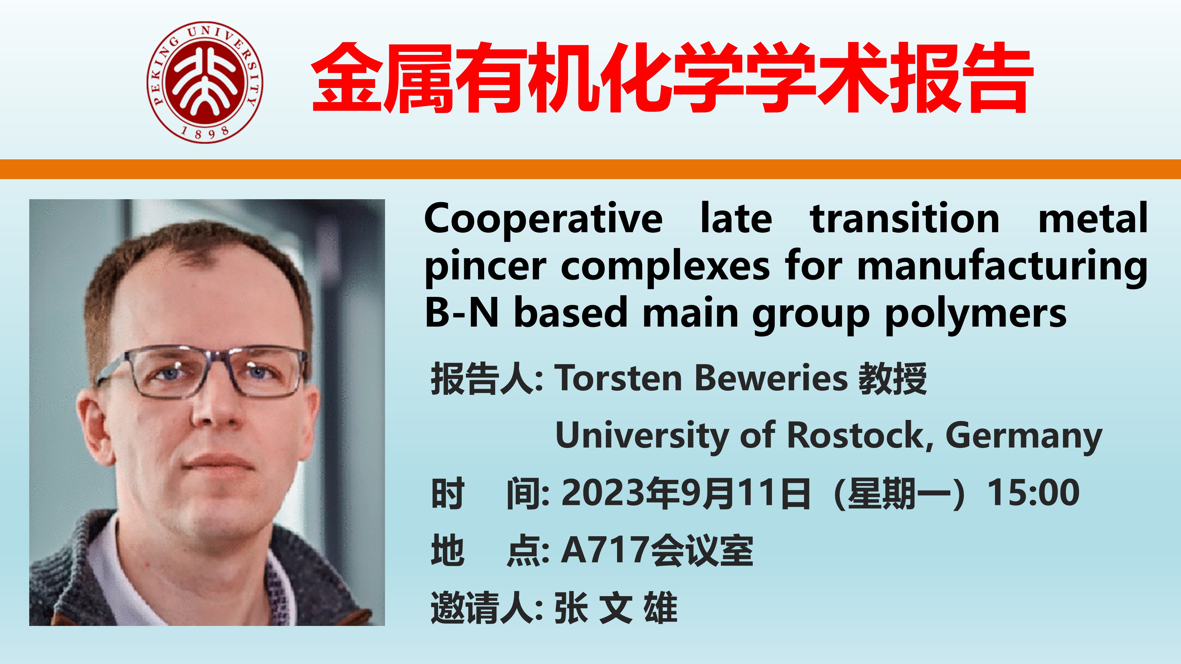 【金属有机化学学术报告】Cooperative late transition metal pincer complexes for manufacturing B-N based main group polymers