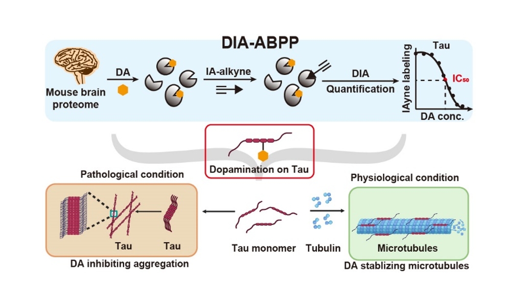 In summary, a quantitative chemoproteomic platform was developed to identify and quantify dopamination sites in the mouse brain. The highly conserved cysteines of Tau were proven to be dopaminated, and this modification prevented Tau’s amyloid fibrillation and promoted Tau-mediated assembly of microtubules.This study not only provides a global portrait of dopamination but also discovers a protective role of DA in regulating the function of Tau, enhancing our understanding of the physiological and pathological functions of DA in the human brain. It also holds significant guiding importance for the development of drugs targeting Tau.