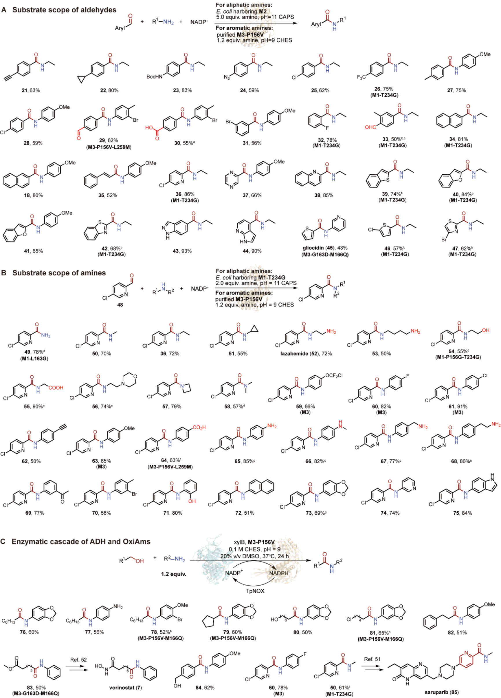图3 氧化酰胺合成酶的底物谱拓展及酶级联体系开发(来源:Science)