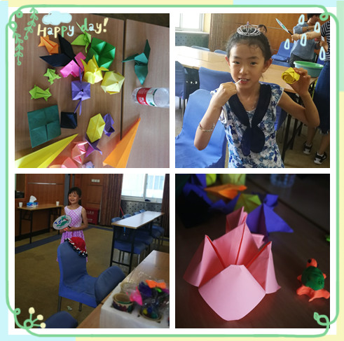 “折出我天地”的志愿者老师首先为孩子们展示了折好的彩纸作品。随后,志愿者向小朋友们讲解折纸方法,一遍遍耐心细致地解说,示范给大家看。孩子们边听边做,个别不会的小朋友向已经学会的小朋友和志愿者老师请教,不一会儿,一张张五颜六色的彩纸在孩子们的手中变成了漂亮的爱心手环、青蛙、百合花、小兔子等作品,小朋友们看着自己的成果都乐开了花,充满成就感。同时还穿插着一些小花絮,一群小朋友围绕着一位爸爸,他正在认真地做着蹲起,小朋友们一起欢快的为他数着数,原来是小朋友们在经典折纸玩具——“东西南北”里写上了各种有趣的游戏选项,在和自己的父母做互动游戏。