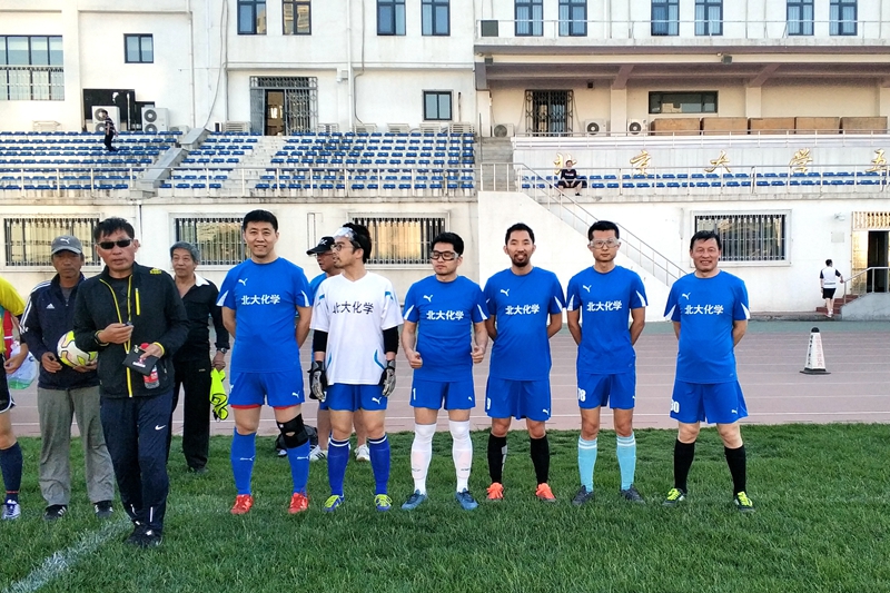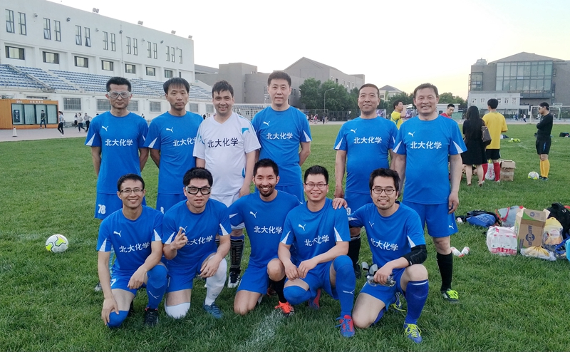 虽然由于伤病和队员转会(博士后出站)参加上届比赛的化院队伍中有多位主力不能出战今年的赛事,但是在前缀长度不输龙妈的(友情提示:这里请先喘口气),球队经理·后勤总管·啦啦队长·专职摄影师·金牌球探·功勋coach·饮水机的守护者贠琳老师的努力下,教工和博后群体中又被发掘出了新的活泼元素,因此化院的首发阵容在保持了后场定海神针王初教授/刘源博士这对师徒组合以及中前场主力段博博士的基础上,又加入了脚法细腻娴熟的陈小向博士、林晓骏博士和霍玉龙师傅。经过开赛初期的相互试探后,化院元素队在稳固防守的基础上利用中前场的技术优势逐渐形成了多次机会,特别是上半时中段换上了善于捕捉机会的前锋余志祥教授以后,通过精彩的中前场配合,余老师连续两次在前场觅得良机,可惜始终欠缺了点运气,两次射门都滑门而过。反观对手,物理-心理联队则主要通过反击寻找埋伏在前场的强点,但是由于队长王初教授和霍玉龙师傅的稳固防守,对手的进攻都被一一化解。如果说上半场因为比分上的0:0略显平淡,下半场则风云突变精彩纷呈。经过上半场的磨合和预热,化院各元素在下半场终于产生了化学反应,不仅打出了多次精彩的中前场配合,边后卫也大胆压上参与进攻。眼看着下半场已时间过半,对手的物理运动和心理活动终究没能抵挡住化学变化的神奇,来自有机化学研究所的博士后陈小向利用对手防线上出现的疲惫和懈怠,抓住机会一脚低平球洞穿了对方门将的十指关!接着元素队更是越战越勇多次威胁对方球门,特别是霍玉龙师傅一脚势大力沉的射门击中立柱异常精彩。最后随着主裁判的哨声,元素队凭借陈小向博士的致胜一球取得了小组赛首场比赛的胜利!
