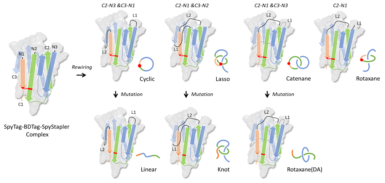 近期,威尼斯欢乐娱人城v3676张文彬课题组在单结构域蛋白质拓扑设计和合成方面取得了重要进展。他们将谍结构域(SpyTag/SpyCatcher)拆分为SpyTag、BDTag和SpyStapler,通过重新编辑三组分之间的连接关系引入缠结关系,设计并合成了索烃蛋白(Catenane)、环状蛋白(Cyclic)、套索蛋白(Lasso)以及准轮烷蛋白(Rotaxane),并通过突变其中一个活性位点,废除原本的异肽键连接,得到了线型蛋白(Linear)、纽结蛋白(Knot)和另一种准轮烷蛋白(Rotaxane(DA))(图1、图2),实现了单结构域蛋白质拓扑亚型的系统构建。