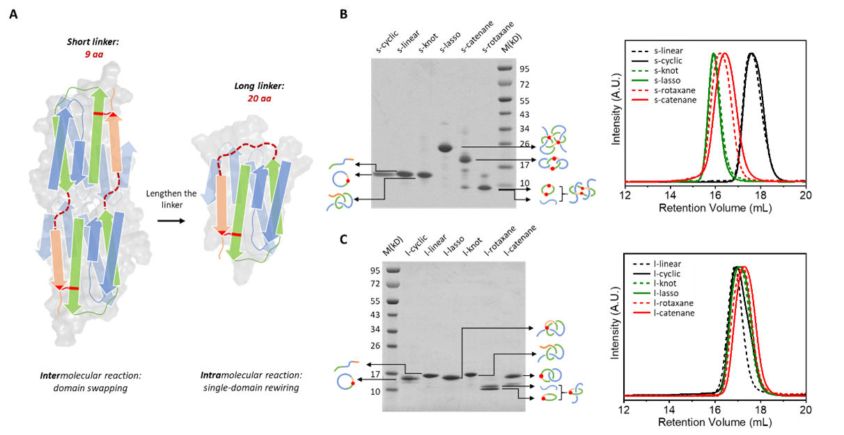 图2. A, 连接链的长度对单结构域拓扑亚型合成选择性的影响。B, 短链接链样品的合成结果。C, 长链接链样品的合成结果。