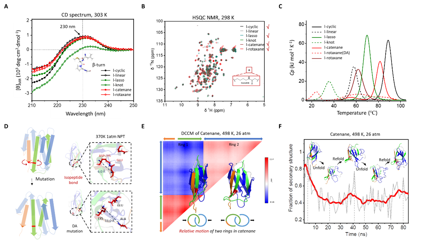 图3. A, 长链样品的圆二色谱表征结果。B, 长链样品的二维核磁表征结果。C, 长链样品的差示扫描量热法表征结果。D, 不含异肽键的突变体中氨基酸逐步远离。E, 索烃蛋白的两个环呈现出明显的负相关运动。F, 索烃蛋白的解折叠模拟中还观察到了瞬时的二级结构恢复现象。