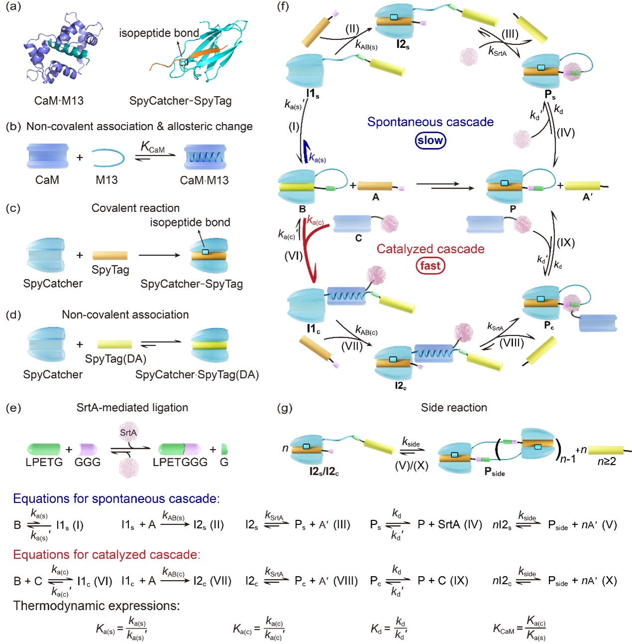 图1 蛋白质催组装模型体系的理性设计。(a) 基元CaM·M13的结构(PDB 编号:1QTX;CaM:紫色;M13:绿色)以及SpyCatcher–SpyTag 的结构(PDB 编号:4MLI;SpyTag:橙色;SpyCatcher:青色)。(b) CaM与M13之间的非共价结合及 M13 结合后发生的构象变化示意图;(c) SpyCatcher与SpyTag之间的共价反应;(d) SpyCatcher与SpyTag(DA)的非共价结合;(e) SrtA 催化的连接反应;(f) 设计的自组装级联与催组装级联;(g) 副反应。
