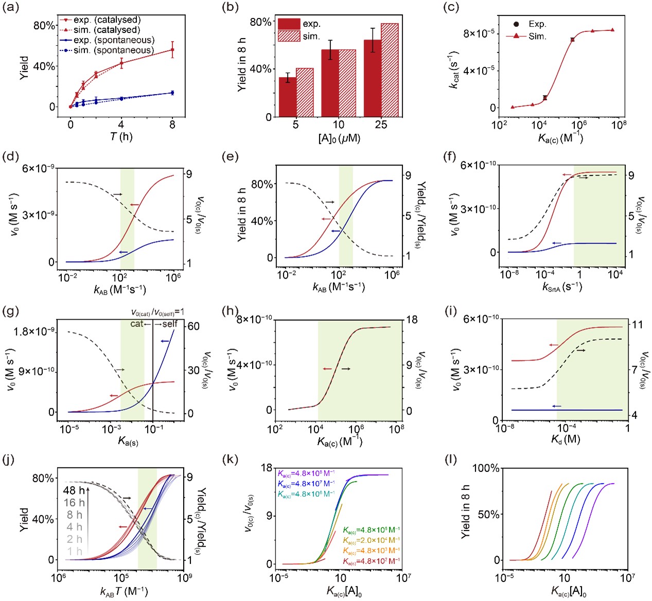 图2. 动力学建模与实验结果对比。实验数据与模拟曲线高度吻合,表明所构建的模型能够准确再现自组装与催组装的动力学过程。进一步的分析揭示,不同参数(如结合常数、反应速率常数和初始浓度)都会显著影响反应的速率和产率,为理解和优化催组装过程提供了重要依据。