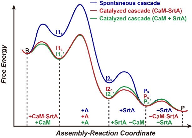图3. 自组装与催组装级联的自由能曲线示意图。横坐标表示组装–反应级联的各个步骤,纵坐标表示相对自由能水平,用以反映各个转化过程的自发性与能量变化。蓝色曲线对应自组装,红色曲线对应使用“融合型”的催组剂,绿色线对应使用“组合型”的催组剂。不同类型的催组剂在不同阶段各有优势。