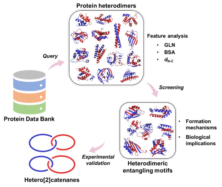 该研究以“Heterodimeric protein entangling motifs: systematic discovery, feature analysis, and topology engineering”为题,近期在线发表于Chemical Science,通讯作者为威尼斯欢乐娱人城v3676张文彬教授,第一作者为威尼斯欢乐娱人城v3676许连杰博士,威尼斯欢乐娱人城v3676博士生田锡宝也为本工作做出了贡献。该工作得到了科技部国家重点研发计划、国家自然科学基金、北京分子科学国家研究中心的资助。