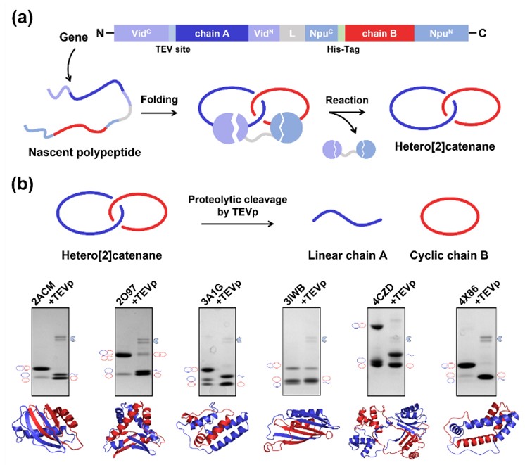 图2. 异质二聚缠结基元的实验验证。(a) 基于异质二聚缠结基元和正交的分离型内含肽实现异质[2]索烃胞内合成的示意图;(b) 通过TEV蛋白酶的酶切实验证明异质[2]索烃的拓扑结构。