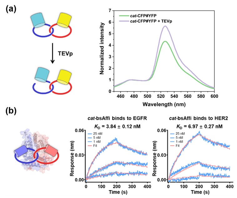 除了直接合成单结构域异质索烃,这些缠结基元还可耐受与不同功能结构域的融合。将CFP和YFP分别融合到缠结基元的两个单体,设计了机械偶联荧光蛋白FRET对,由于索烃骨架的构象限制,酶切后FRET信号明显增强,证明索烃结构可被应用于调控功能基元的距离和取向(图3a)。而将两种亲和体AffiHER2和AffiEGFR分别融合到缠结基元的两个单体上,则可很好地保留亲和体的受体结合能力,得到双特异性抗体类似物,证明异质索烃结构在多功能集成方面具有出色的应用潜力(图3b)。